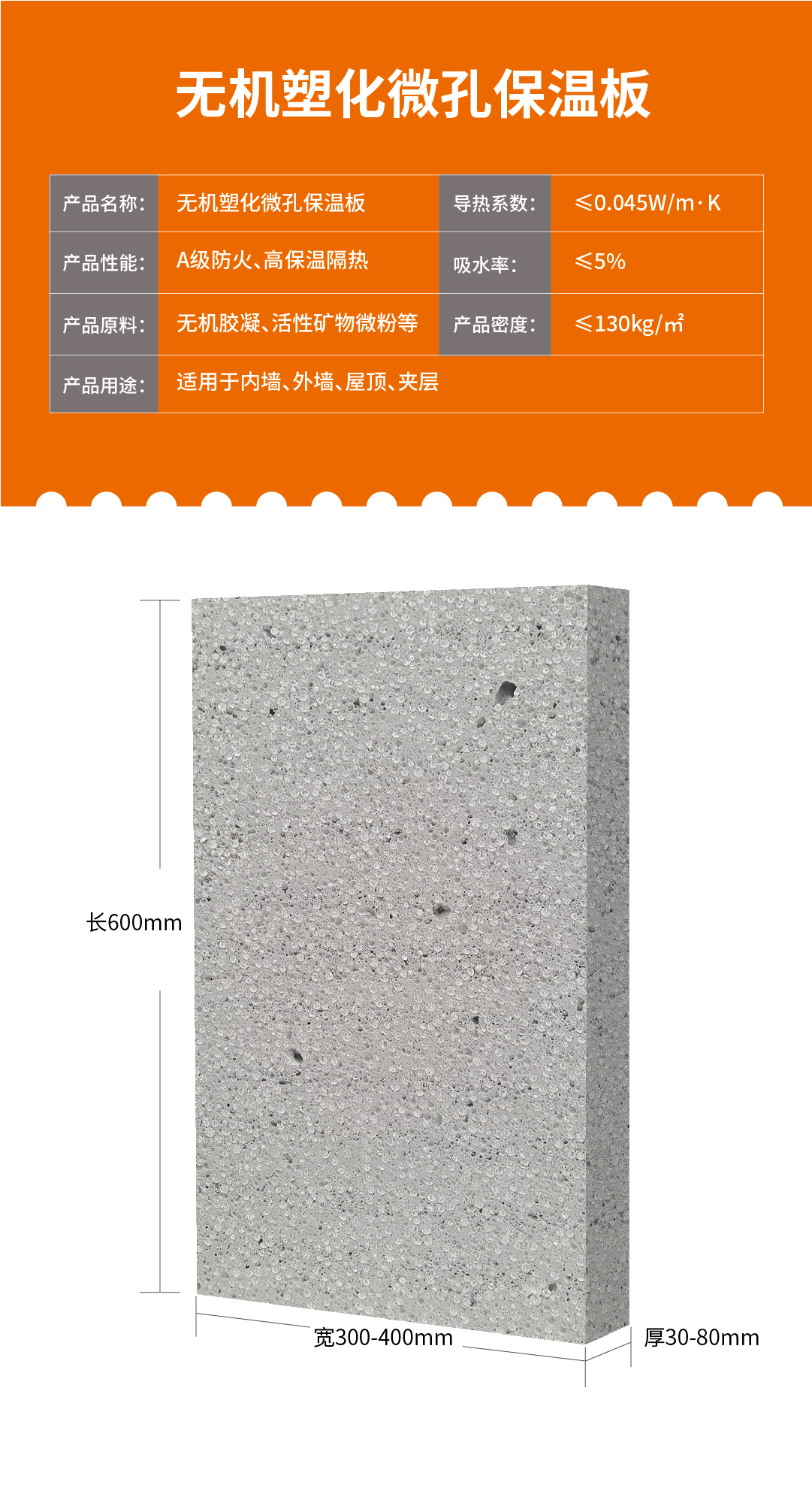 無機塑化微孔保溫板是由鄭州工大高新材料科技有限公司經過7年潛心研究,具有國內領先地位和自主知識產權的最新產品。產品是以無機類材料為主要原料,經過特殊的物理發泡制成的一種板狀保溫材料,具有質輕、高強、不吸水,保溫、防火、價格優等特性。經國家建筑節能質量監督檢驗中心產品檢驗,各項技術性能指標均大大高于國家現行行業標準。