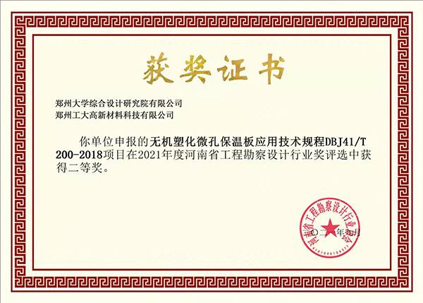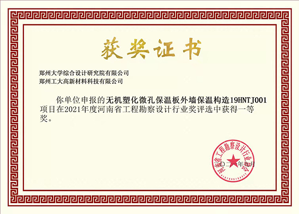 近日,“2021年度河南省工程勘察設計行業獎評選”揭曉,由鄭州大學綜合設計研究院有限公司與我司共同申報的“無機塑化微孔保溫板外墻保溫構造19HNTJ001”、“無機塑化微孔保溫板應用技術規程DBJ41/T 200-2018”項目分別榮獲一、二等獎。
